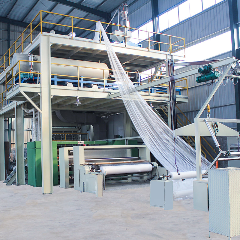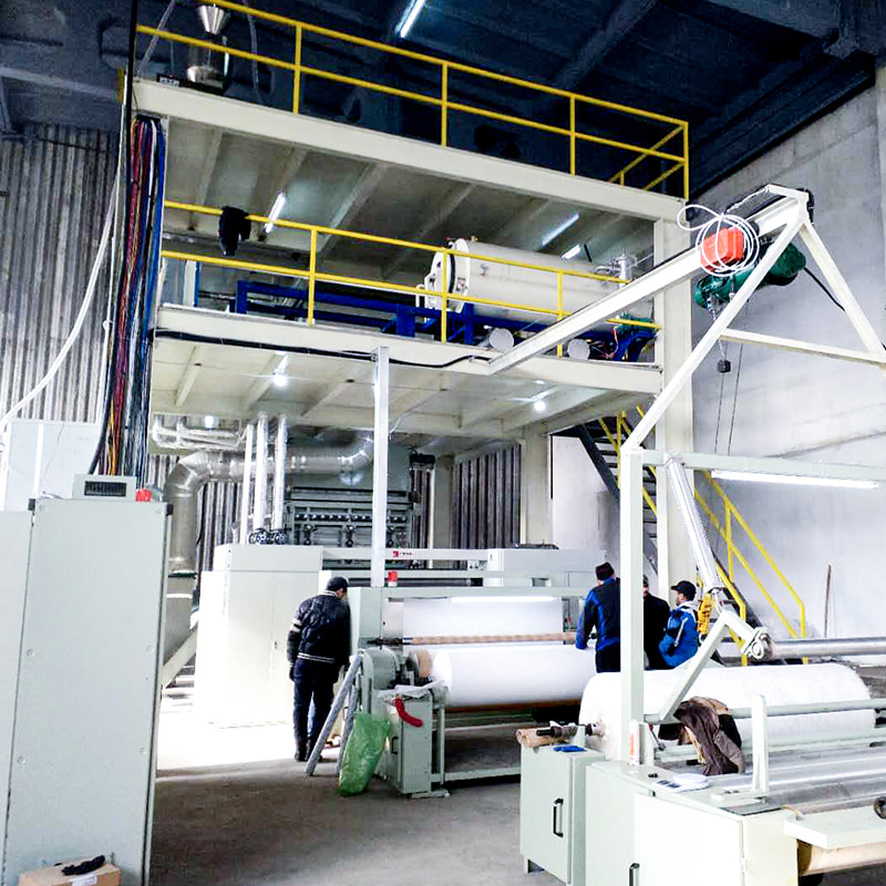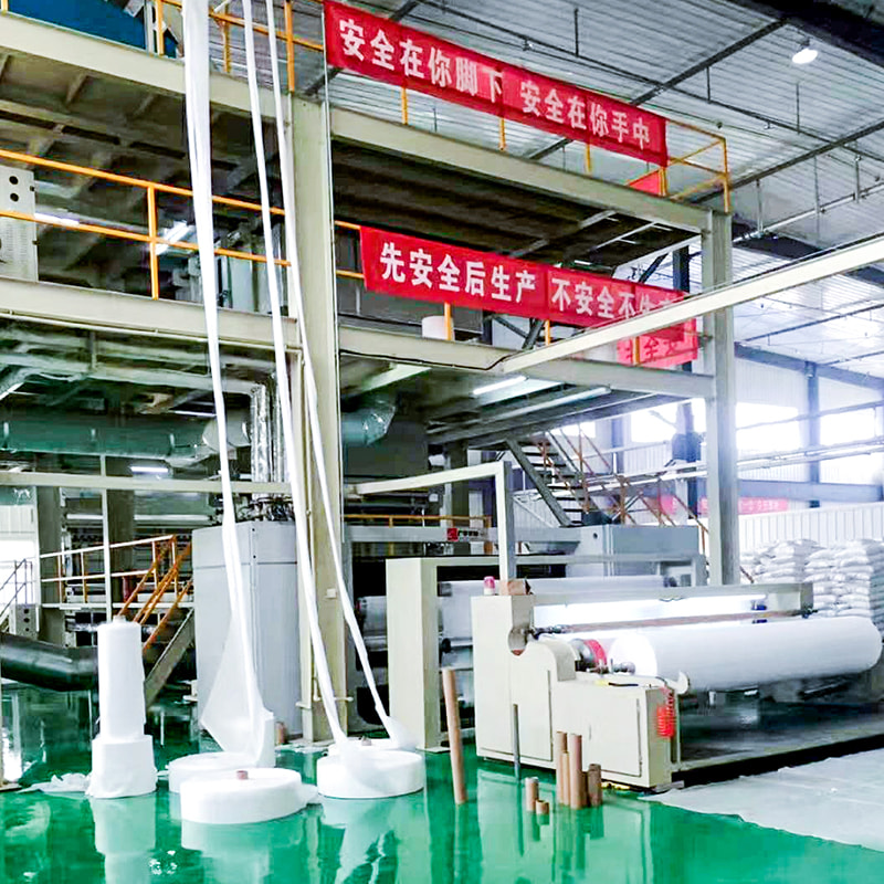 Eine PP-Spunbond-Vliesstoffmaschine wird zur Herstellung von PP-Spinnvliesstoff verwendet. Mit dem Rollenschneider in unserer Maschine kann der Stoff in jede beliebige Breite geschnitten werden, um unterschiedlichen Anforderungen gerecht zu werden. Die Maschinenlaufgeschwindigkeit beträgt 10–150 m/min, Filament-Denier: 1,8–2,3 Denier