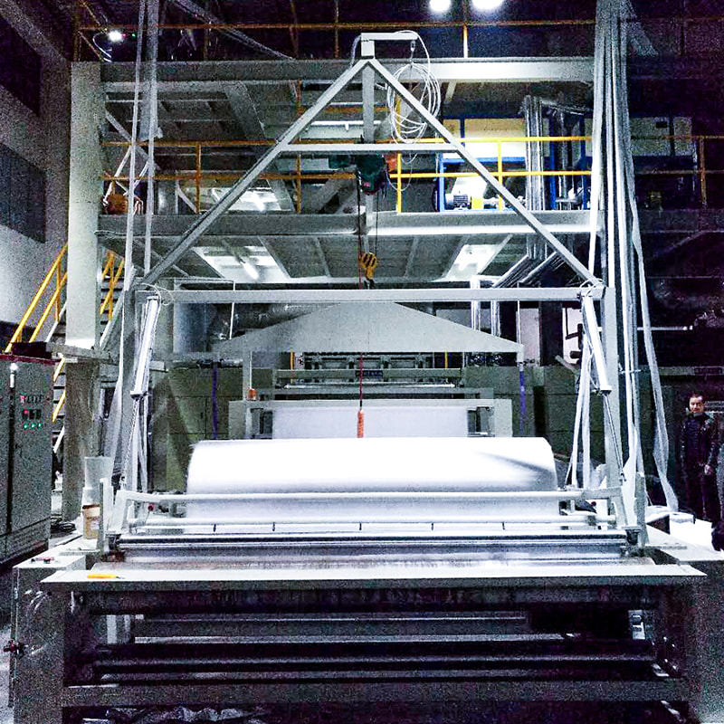 Eine PP-Spunbond-Vliesstoffmaschine wird zur Herstellung von PP-Spinnvliesstoff verwendet. Mit dem Rollenschneider in unserer Maschine kann der Stoff in jede beliebige Breite geschnitten werden, um unterschiedlichen Anforderungen gerecht zu werden. Die Maschinenlaufgeschwindigkeit beträgt 10–150 m/min, Filament-Denier: 1,8–2,3 Denier