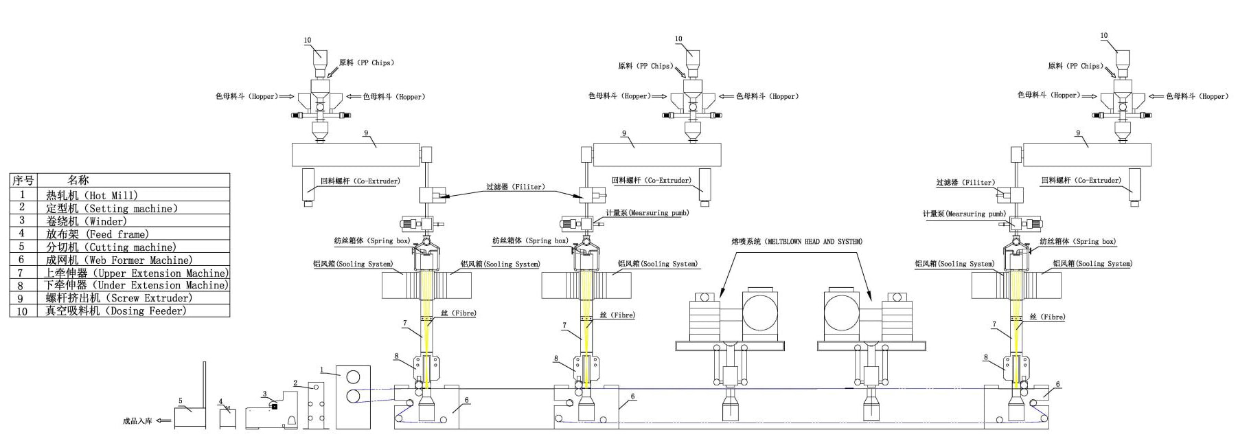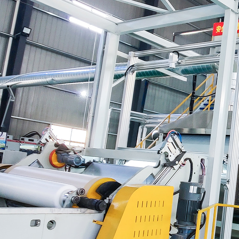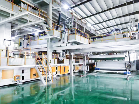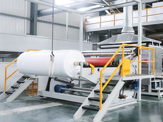 Eine PP-Spunbond-Vliesstoffmaschine wird zur Herstellung von PP-Spinnvliesstoff verwendet. Mit dem Rollenschneider in unserer Maschine kann der Stoff in jede beliebige Breite geschnitten werden, um unterschiedlichen Anforderungen gerecht zu werden. Die Maschinenlaufgeschwindigkeit beträgt 10–350 m/min, Filament-Denier: 1,8–2,3 Denier